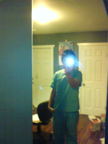 前兩天買的scrub,穿上後,我的外表真的是塊作醫生的料,沒有讀醫真的是太可惜了。由於臉長得太帥,用閃光燈處理掉。
