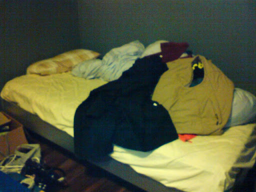 這是床,沒錯,他是床。被我的衣服給淹沒了。是我每天晚上做夢的地方。